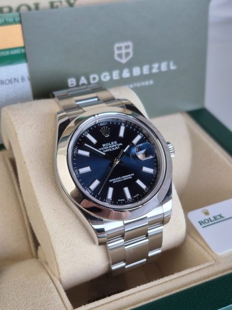 Te koop aangeboden: een stijlvolle Rolex Datejust II ref. 116300 uit 2017. Dit model is uitgevoerd met de geliefde blauwe sunburst dial, die het horloge een moderne en frisse uitstraling geeft.