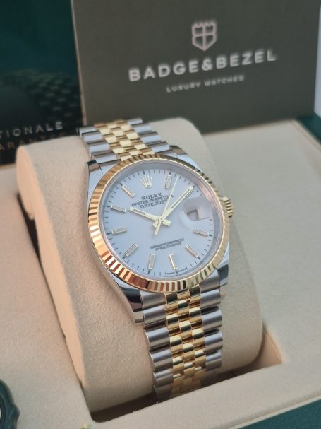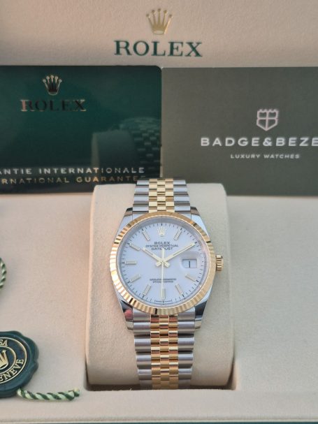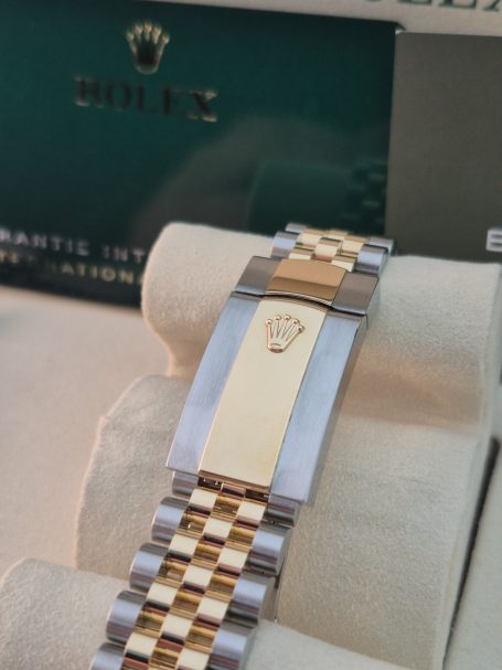 De witte dial met gouden uurmarkeringen en wijzers zorgt voor een fris, elegant contrast met de warmgouden bezel en middenstukken van de Jubilee-band. Een model dat moeiteloos te dragen is bij elke gelegenheid – van zakelijk tot casual chic.