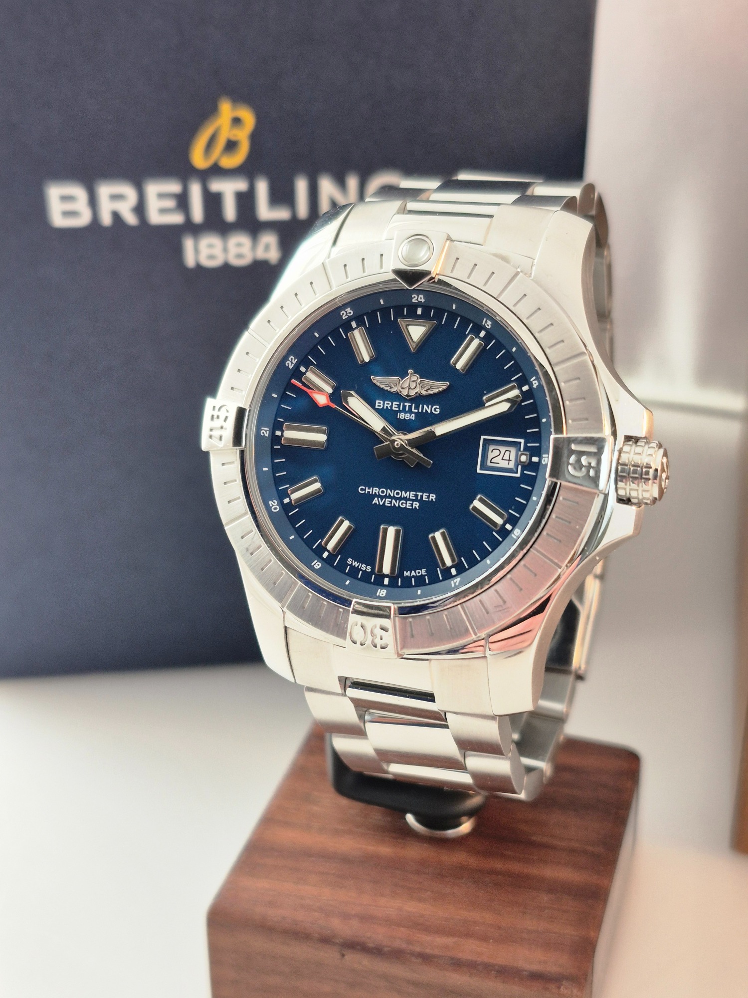 Dit exemplaar verkeert in zeer nette staat en wordt geleverd als volledige set, inclusief doos en papieren. De solide stalen kast en karakteristieke Avenger-bezel met rider tabs geven het horloge zijn herkenbare Breitling-DNA.